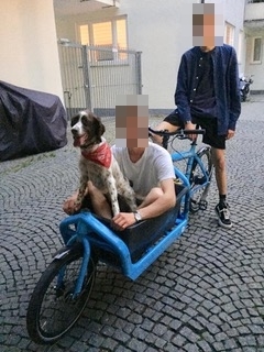 In der Pflegestelle wird sie Juri genannt und hat sich gut an den Namen gewöhnt. Ihre Ängste hat sie mittlerweile abgelegt und geht offen und freundlich auf Menschen zu. Bis zu 2 Stunden bleibt sie auch schon gut alleine, hat aber das Glück, dass die Pflegestelle sie fast überall hin mitnehmen kann. Sie fährt gerne im Auto mit, leider wird ihr aber regelmäßig übel... Andere HUnde mag sie sehr und möchte mit ihnen toben und rennen. An der Leine geht sie mittlerweile recht ordentlich. Nach wie vor ist sie draußen eine kleine Jagdsemmel und wird deshalb nicht abgeleint. Sie würde das Gelände eigenständig nach Beute durchstreifen und erst zurück kommen, wenn sie nichts mehr findet. Da sie sehr bewegungsfreudig ist, läuft sie viel am Rad mit, darf sich zwischendurch bei längeren Touren aber auch in einer extra für sie gebauten Kiste ausruhen. Auch ausgedehnte Wanderungen findet sie super. Amelie (Juri) ist eine tolle Begleiterin und macht das alles super. Ob im Zug, in der Uni, beim einkaufen oder bei Freunden zu Besuch, ob in vollen Cafés oder auf dem Markt, sie bleibt entspannt und hat ihre frühere Angst vor Menschen komplett abgelegt.