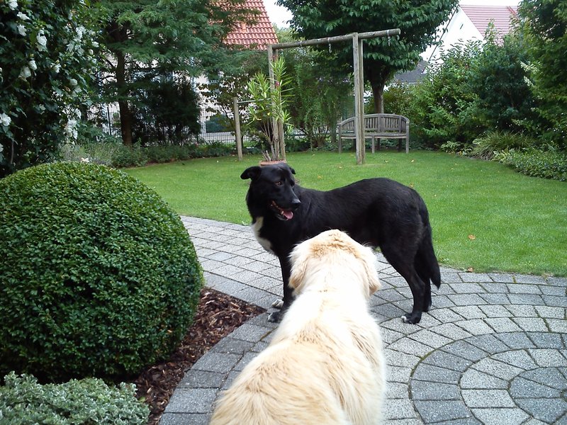 Auf seinen Namen hört er ganz gut, nur versteht er noch nicht ganz, warum man beim Halsband anlegen oder wenn man auf das Futter wartet Sitz machen muss. Seit dem 1. Tag ist Bean stubenrein und akzeptiert Tabus in Bezug auf Zimmer oder Essen auf dem Tisch. Er bleibt bisher mit unserer Hündin ca. 3 - 4 h allein und dekoriert nichts um, liegt dann im Hundebett und geht nicht aufs Sofa. Im Garten ist er wachsam, aber kein Kläffer und reagiert nur bei ihm unbekannten Geräuschen oder Personen.