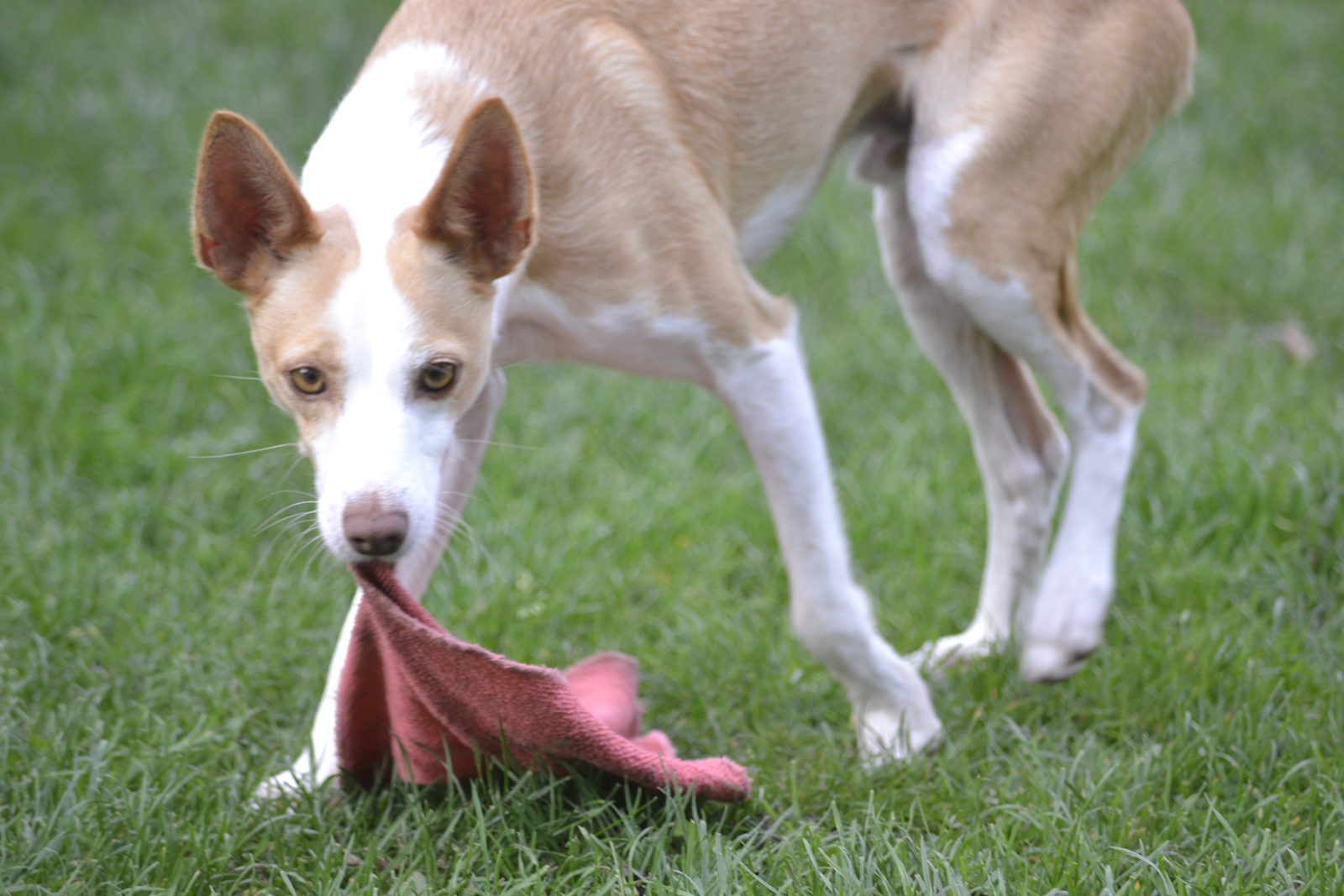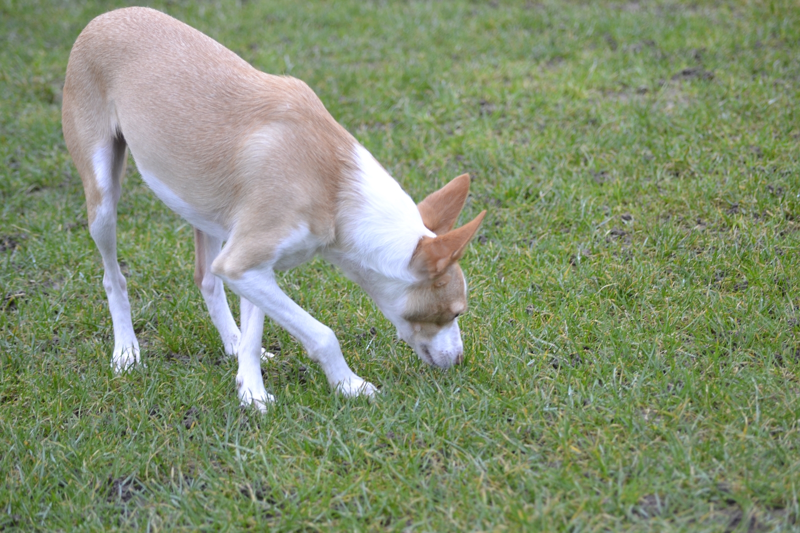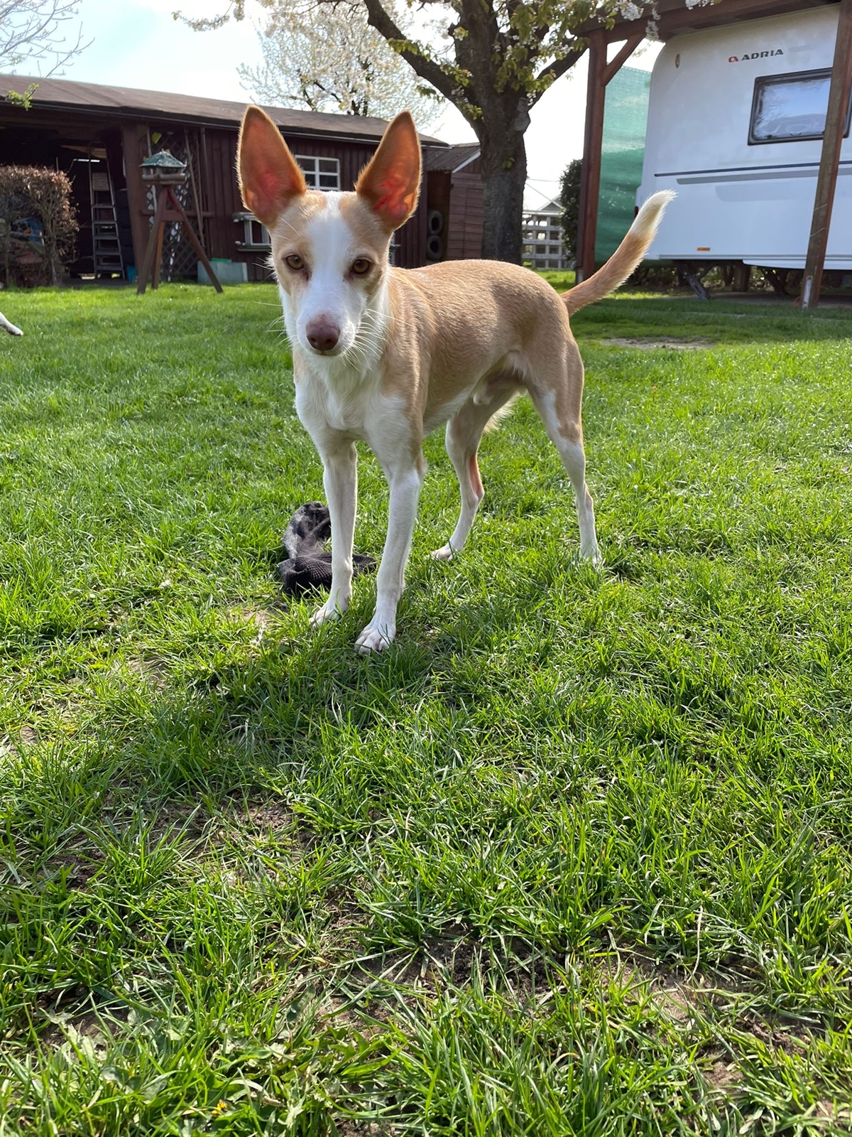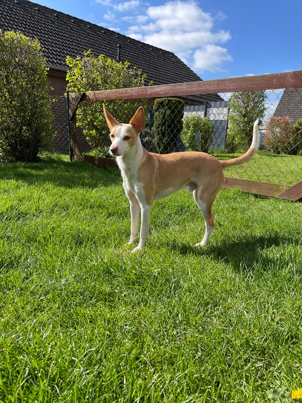 Typisch für einen Podenco zeigt sich nun ein wenig Jagdtrieb. Er rennt im Garten sofort zur Hecke, wenn dort ein paar Vögel sitzen. Aber nicht nur Vögel sind sein Beuteschema, auch im Garten umherfliegende Blätter bekommen seine Aufmerksamkeit. Eigentlich alles, was sich im Garten durch eine Windbö bewegt.