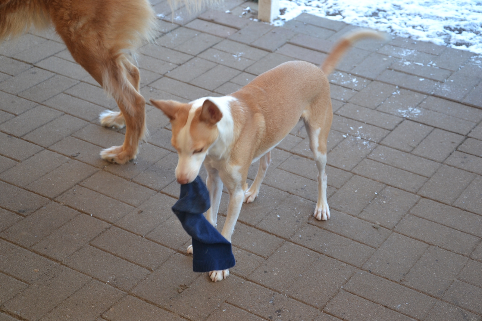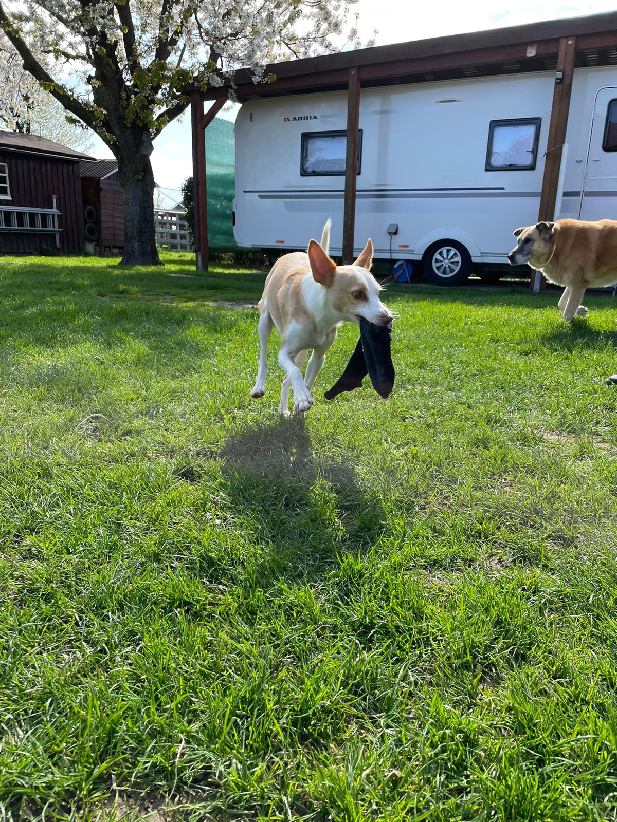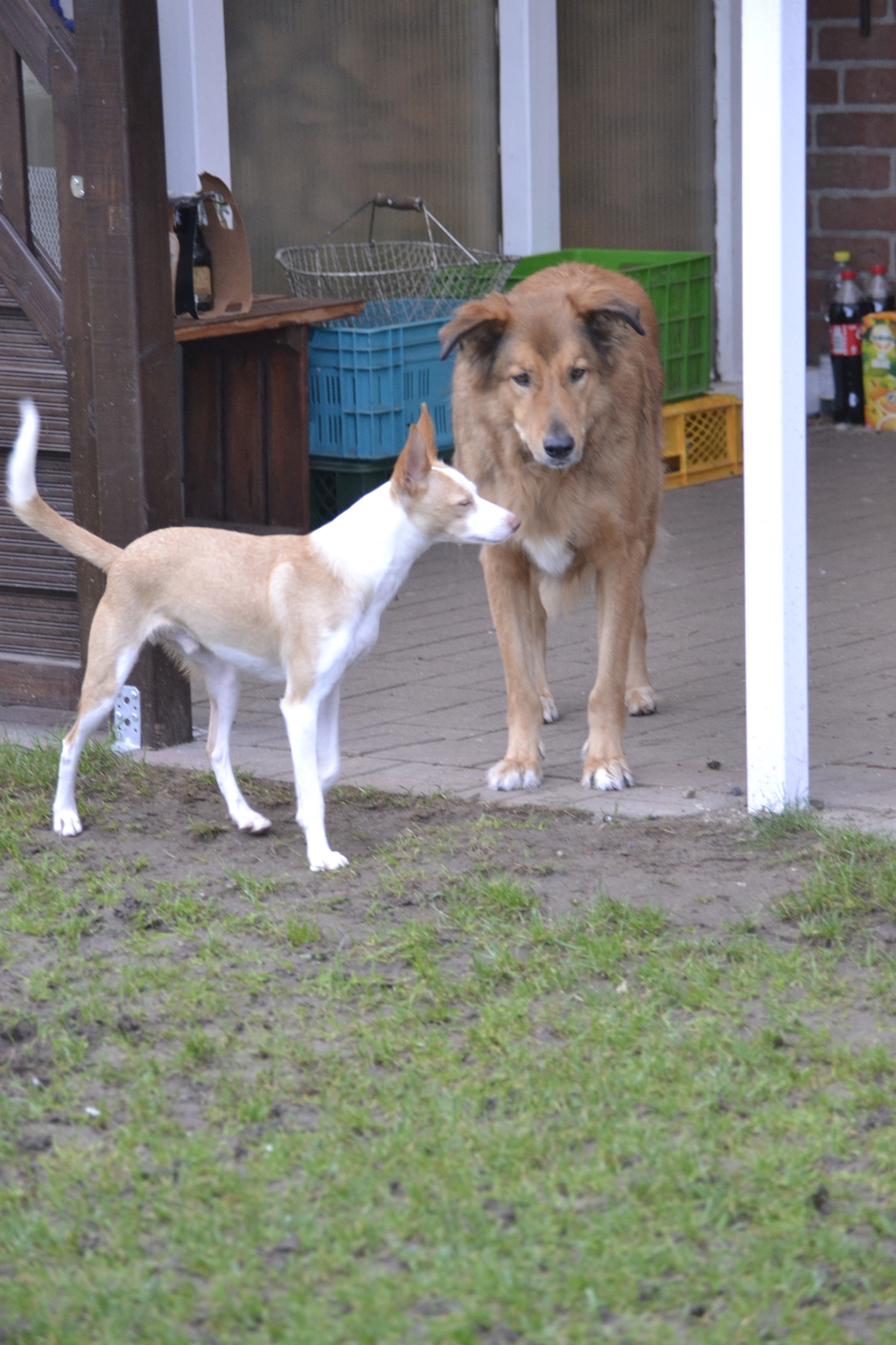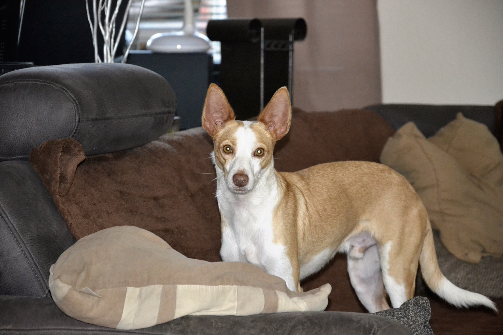 Typisch für einen Podenco zeigt sich nun ein wenig Jagdtrieb. Er rennt im Garten sofort zur Hecke, wenn dort ein paar Vögel sitzen. Aber nicht nur Vögel sind sein Beuteschema, auch im Garten umherfliegende Blätter bekommen seine Aufmerksamkeit. Eigentlich alles, was sich im Garten durch eine Windbö bewegt.