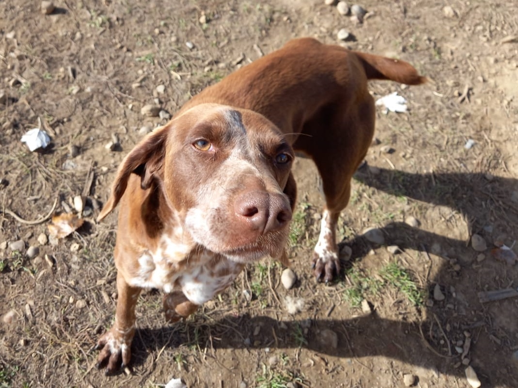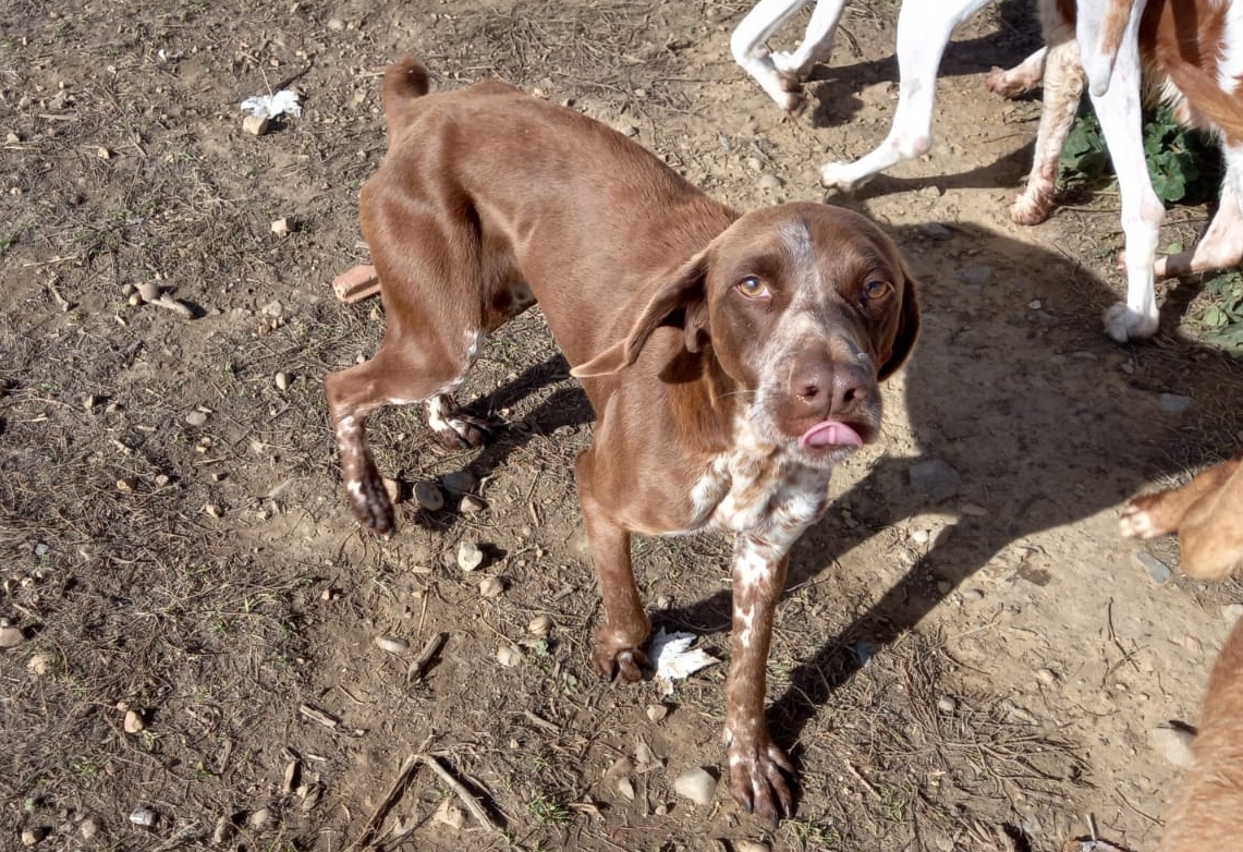 Diese schöne, schokobraune Hündin ist Chona. Chona wurde von unseren Kollegen in Spanien in einer Tötungsstation entdeckt und kurzerhand mitgenommen. Nun lebt sie in einem Refugium, wo sie gut versorgt wird und hin und wieder eine streichelnde Hand ergattert.