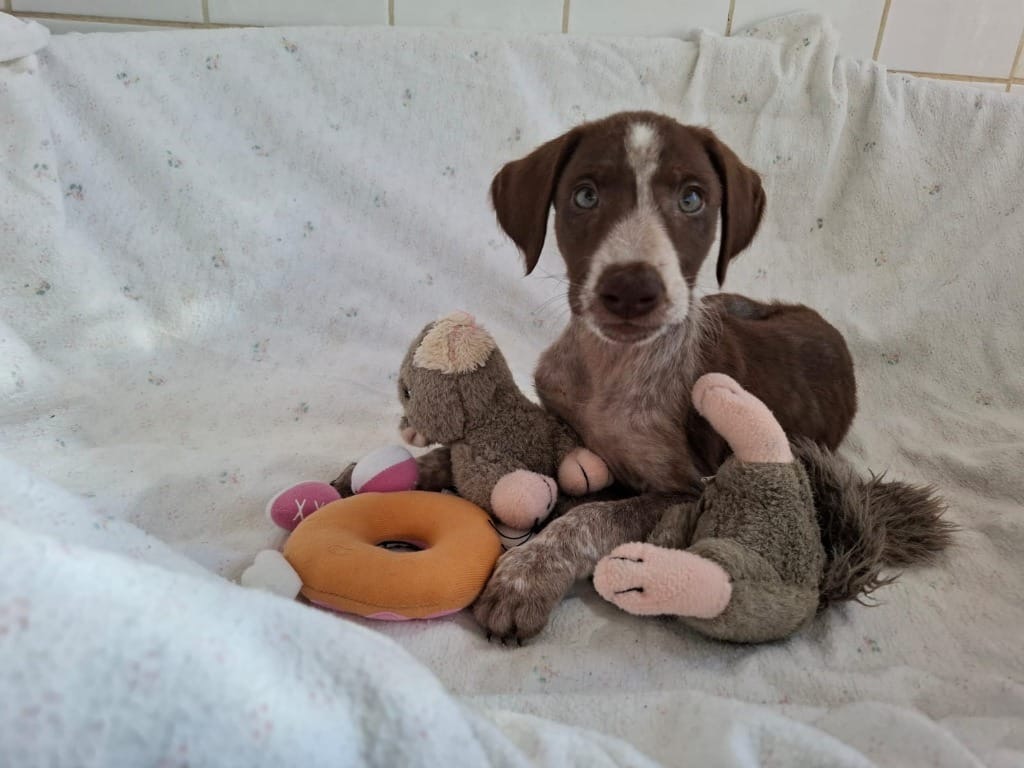 Jenna wurde mit ihren Geschwistern in den Feldern gefunden. Es waren 12 Welpen, es konnten letztendlich aber nur 6 Welpen gerettet werden. Von den restlichen Welpen und der Mama keine Spur. Jenna ist jetzt in Sicherheit und kann in Ruhe größer werden. Jenna ist aufgeschlossen, lieb und verspielt. Natürlich hat sie auch eine Menge Flausen im Kopf.