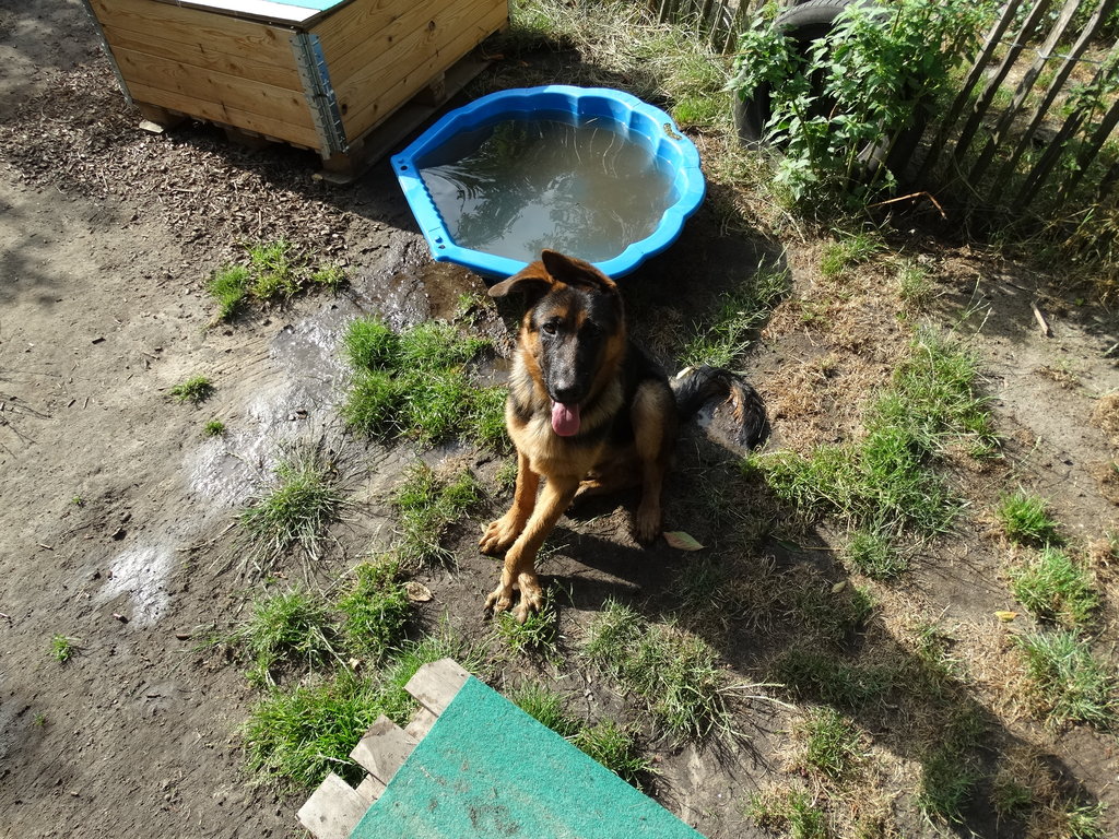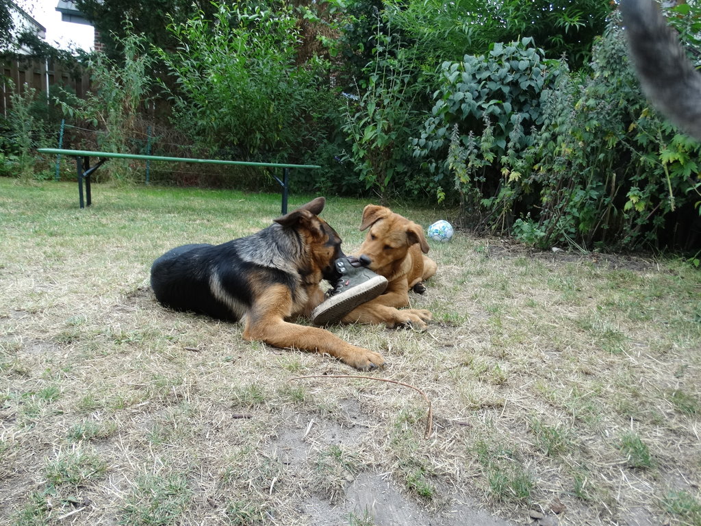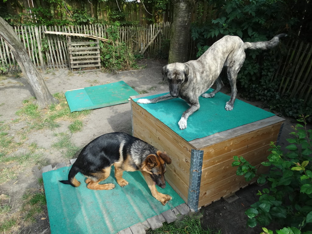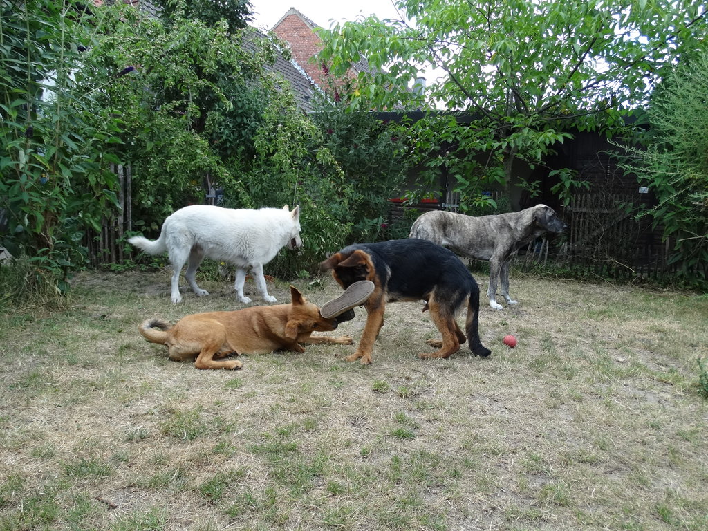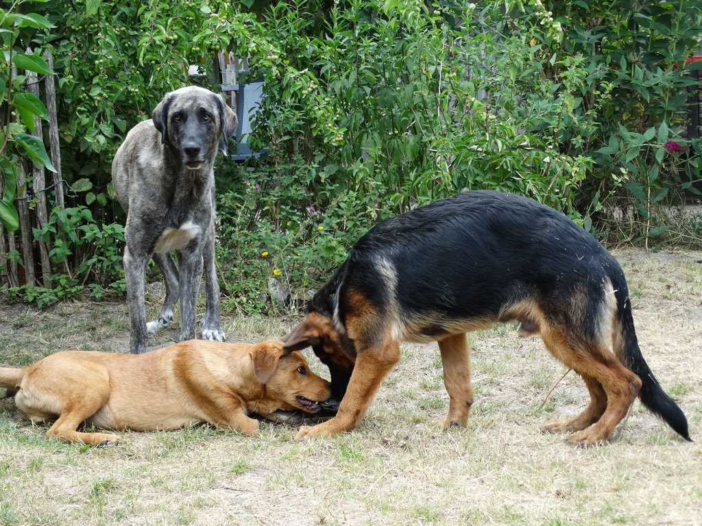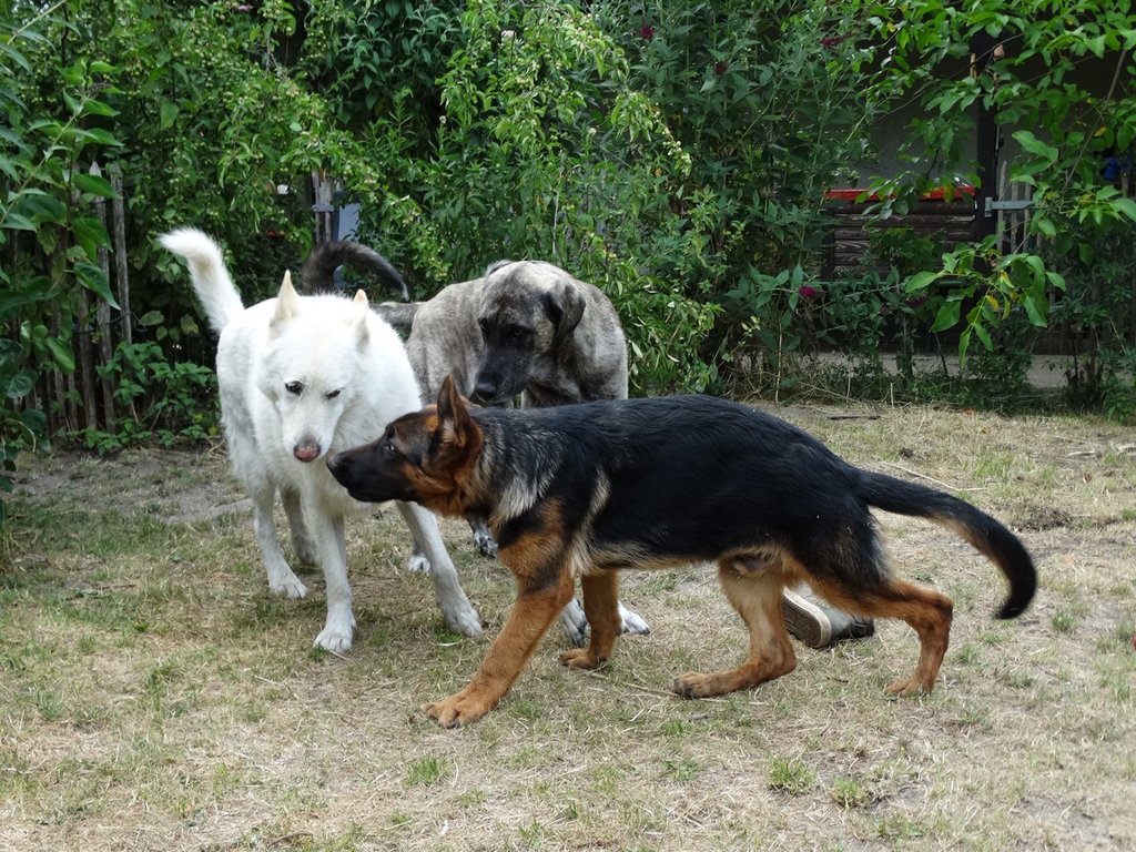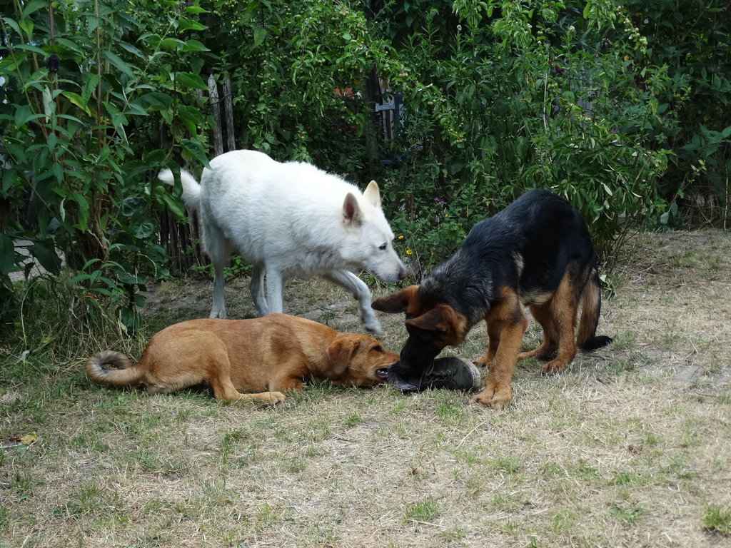 Trockenfutter ergänzt. Die Gesamtheit ist wichtig, da er wohl in den ersten Monaten nur eine einseitige Fütterung erhalten konnte und dies seinen deformierten Körperbau keine Substanz auf bauen lies. Durch viel Aufenthalt im Freien igemeinsam mit anderen Rudelmitgliedern wird Leon immer öfters zum Spielen ermuntert, dem er gerne nach kommt. Auch dem Kräftemessen bei kleinen Gelegenheiten kommt Leon inzwischen fröhlich nach