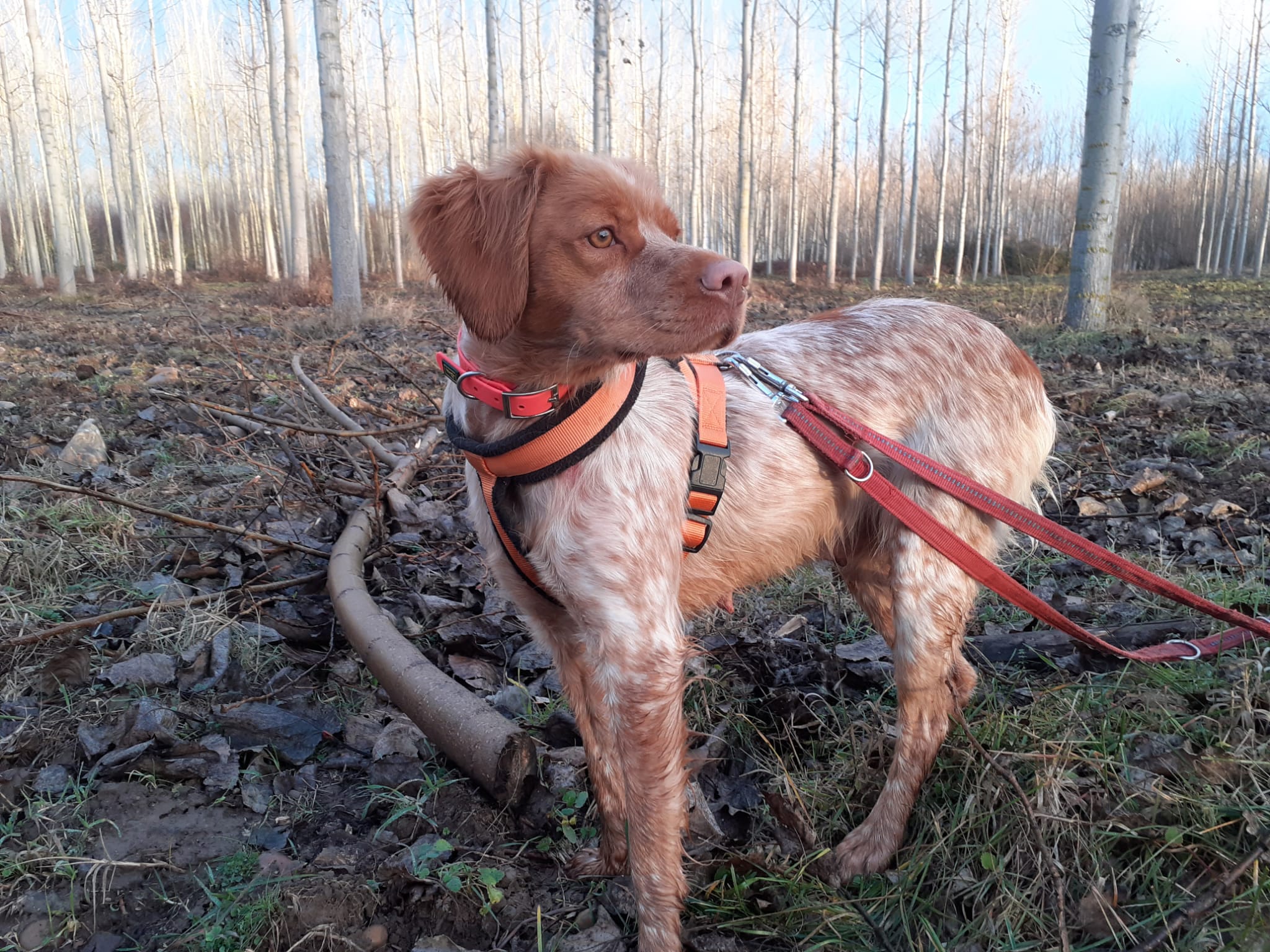 Draußen ist Mena sehr lebhaft, sie liebt es zu rennen und zu spielen. Bretonen mäßig ist sie sehr an Vögeln interessiert, zeigt aber momentan noch nicht übermäßig viel Jagdtrieb.