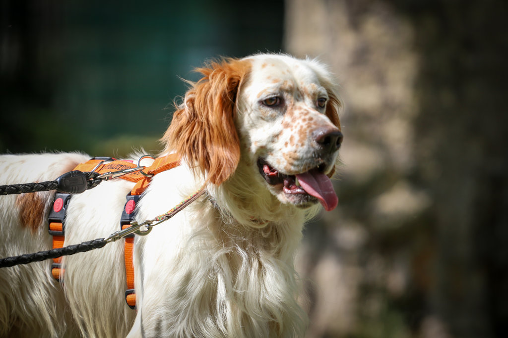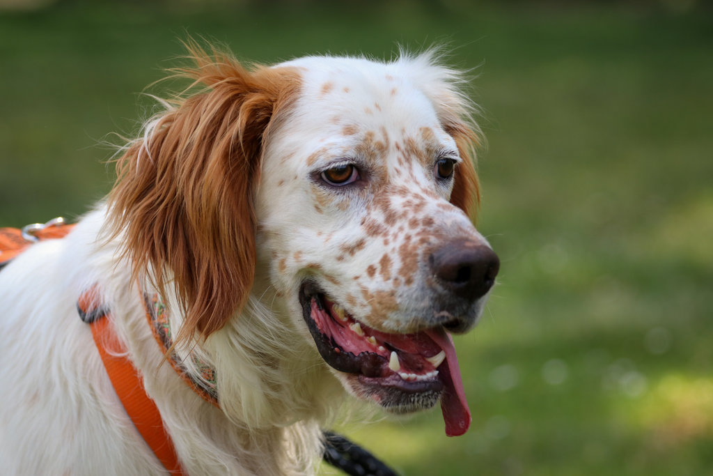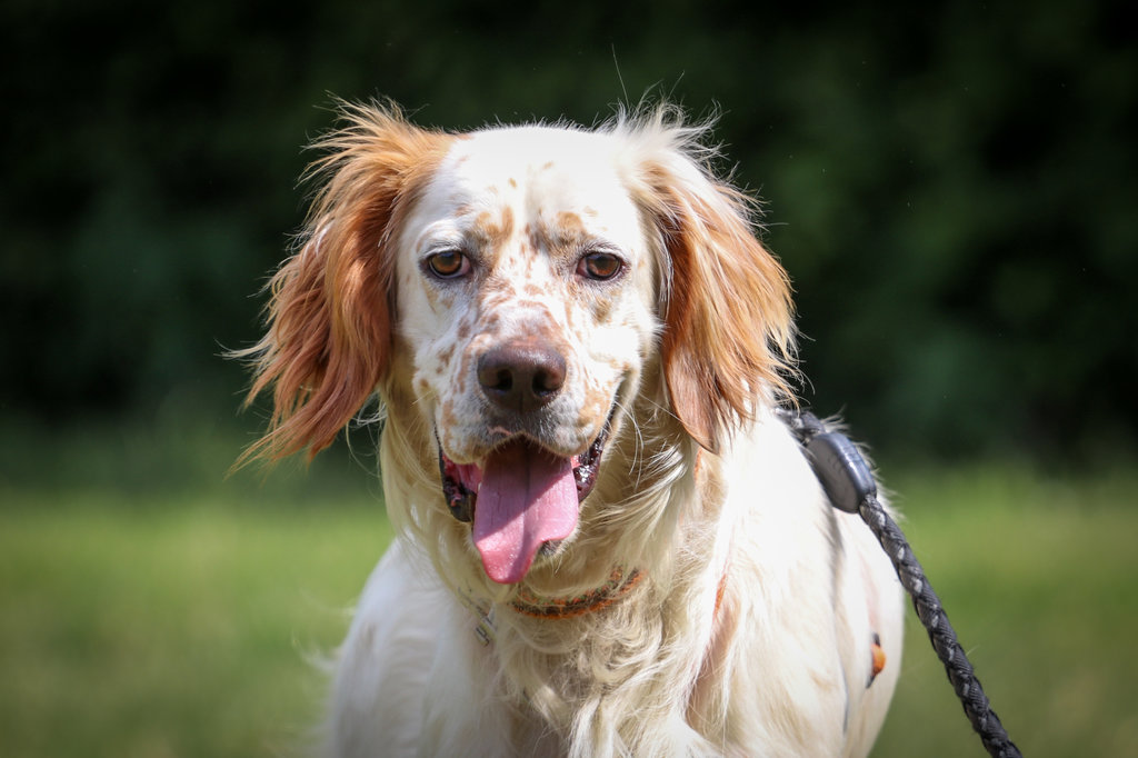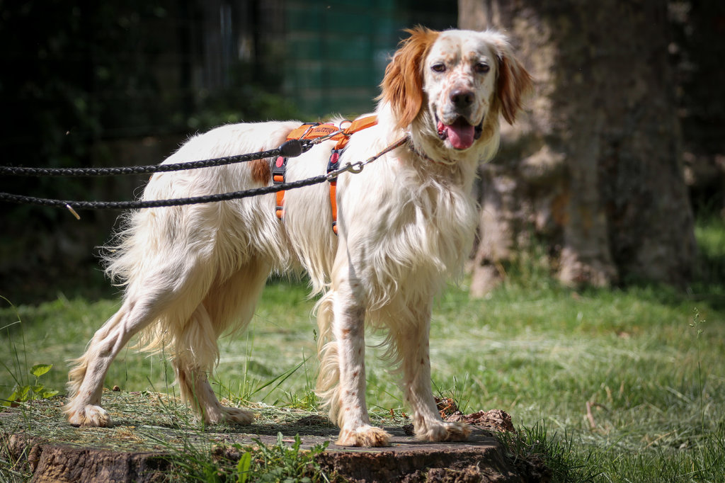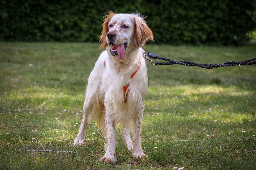 Der hübsche Setterclown liebt den Garten der Pflegefamilie. Seine liebste Beschäftigung ist es, Vögel in den Bäumen und Sträuchern zu beobachten und auch schon mal vorzustehen – man ist ja schließlich ein Setter auch buddeln findet er ganz klasse.