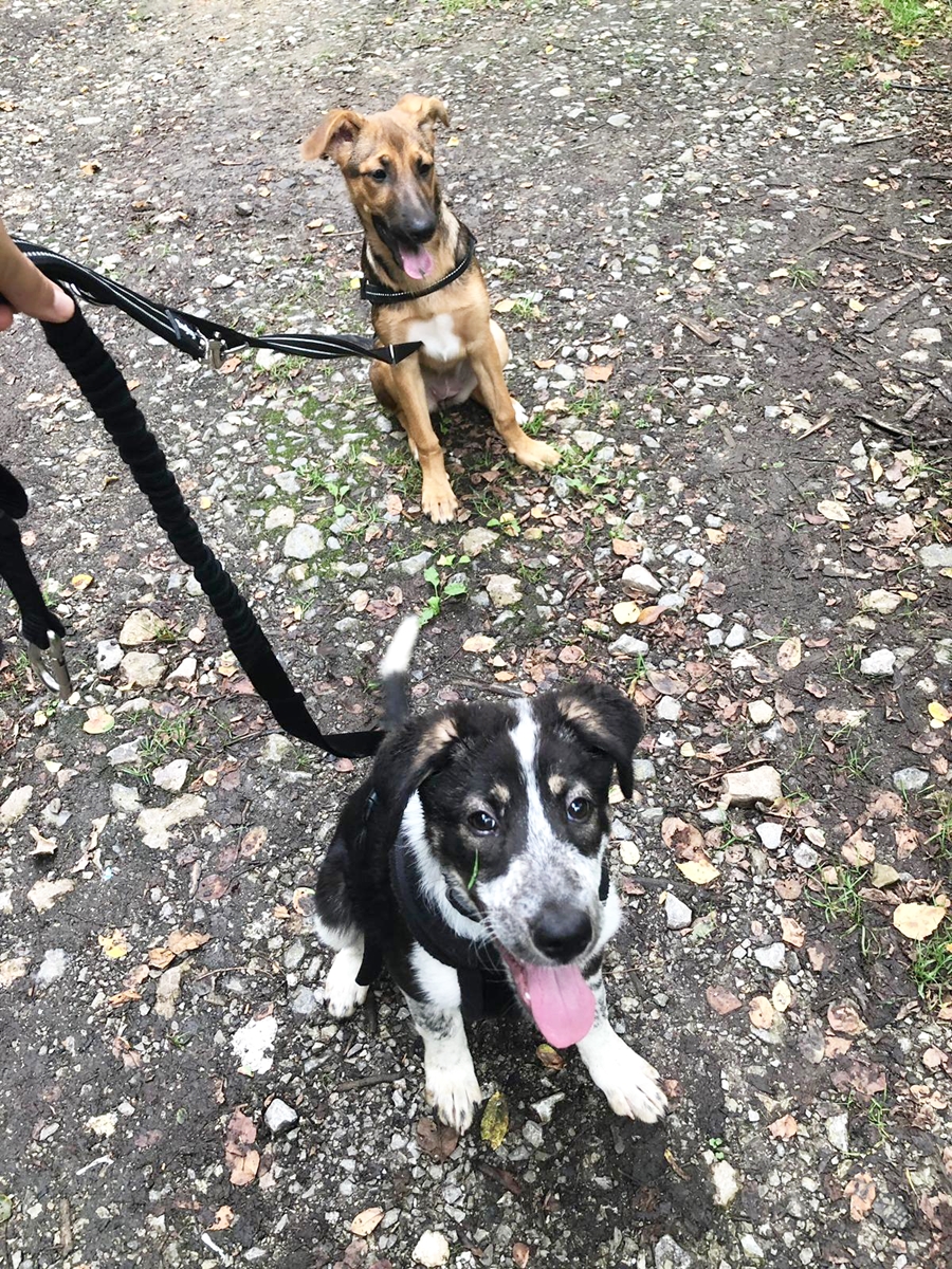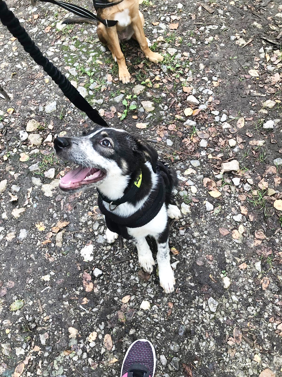 Beim Spazierengehen im Wald ist Milana entspannt, aber da, wo Verkehr ist, wird sie noch unsicher. Autos und Fahrräder machen ihr momentan noch etwas Angst. Daran arbeitet die Pflegestelle nun mit ihr, wie auch an der Leinenführigkeit im Allgemeinen.