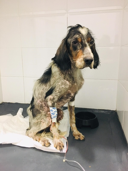 Beim Tierarzt stellte sich dann schnell heraus, dass er Leishmaniose positiv ist und umgehend gehandelt werden musste, weil er es sonst nicht geschafft hätte. Die Behandlung schlug glücklicherweise wirklich gut an. Er nahm an Gewicht zu, das Fell wuchs wieder und er konnte auf eine Pflegestelle umziehen. Es schien alles bergauf zu gehen, bis dann Polypen in der Blase festgestellt wurden und er auch noch positiv auf Ehrlichiose getestet wurde. Es ging ihm sehr schlecht. Täglich bangten die Tierschützer um sein Leben. Aber Olmo ist ein Kämpfer und auch die Ehrlichiose überstand er.
