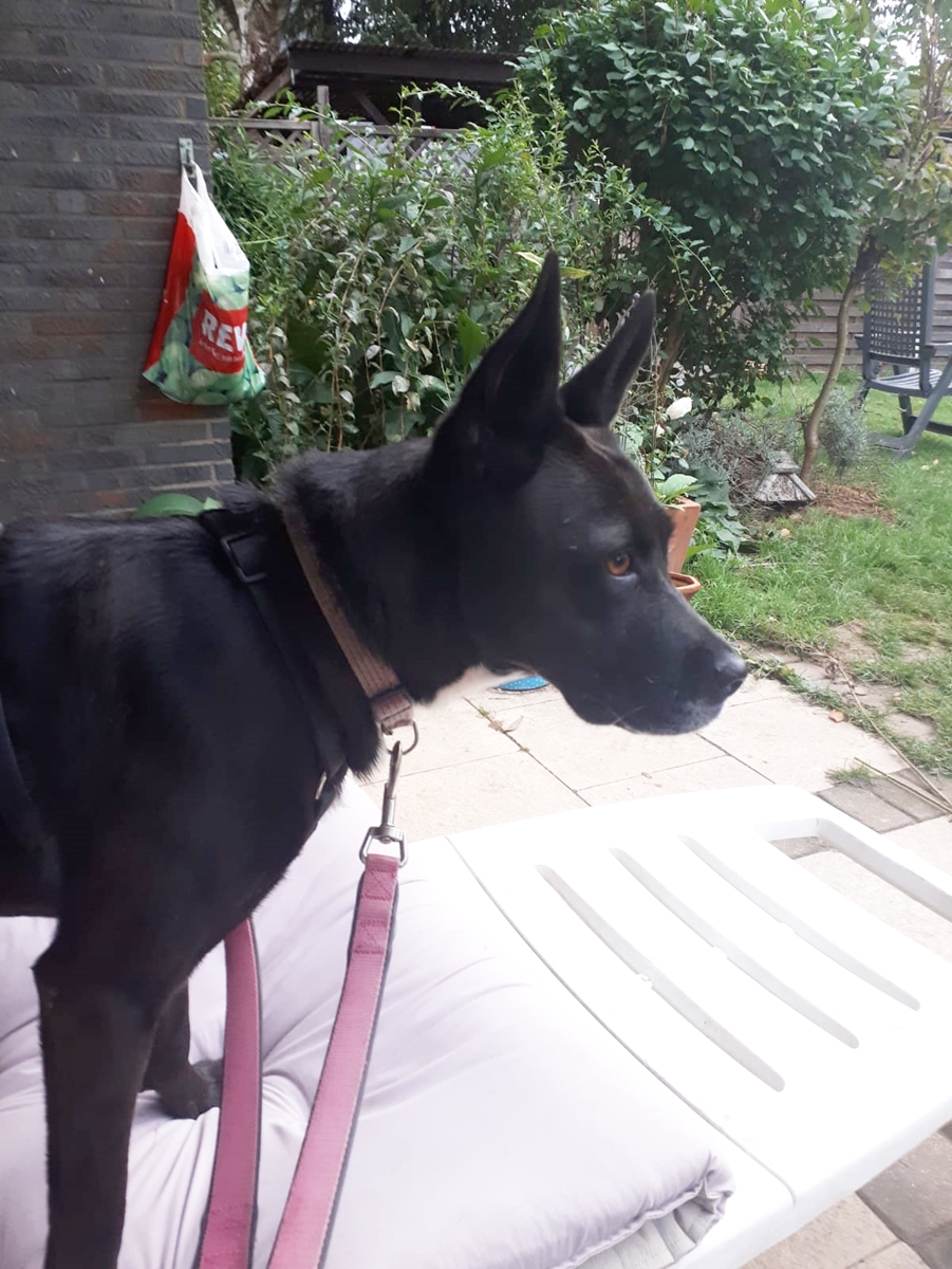 Reinina ist ein mittelgroße Hündin, die mit Sicherheit Schäferhundblut in sich hat, da sie sehr gelehrig ist und sehr genau beobachtet, was ihr Mensch macht.