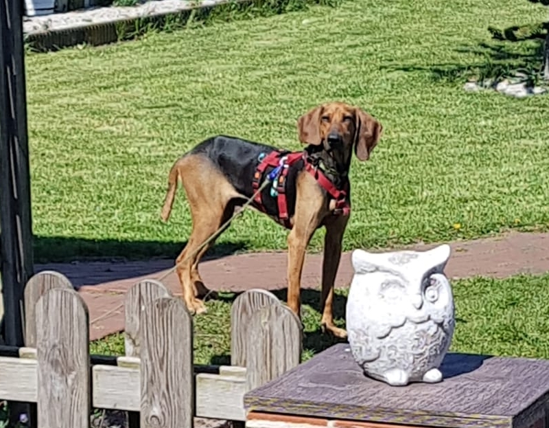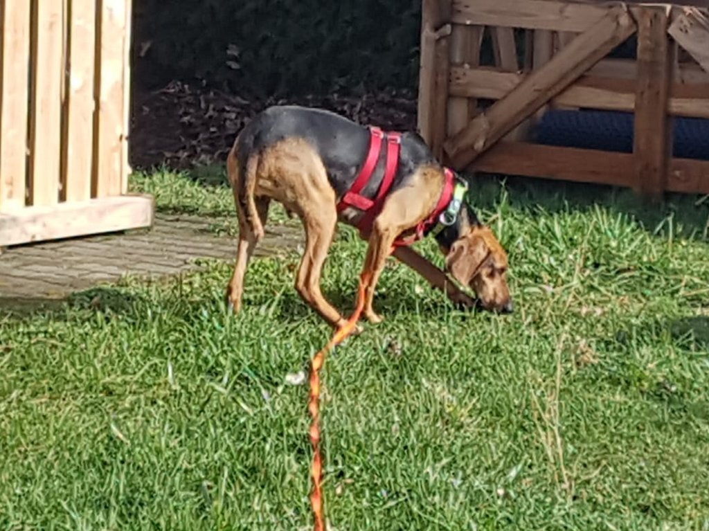 Im März 2021 ist Rocher in seiner Pflegestelle in Deutschland angekommen. Dort ist er zwar noch ängstlich, aber wie alle Hunde auch ziemlich neugierig und so gelingt es immer öfter, dass er über seinen Schatten springt und seine Angst vergisst. Das Futter nimmt er aus der Hand und wagt sich so immer mehr in die Nähe von Menschen. Man merkt ihm halt an, dass seine Erfahrungen mit uns bisher nicht die besten waren.