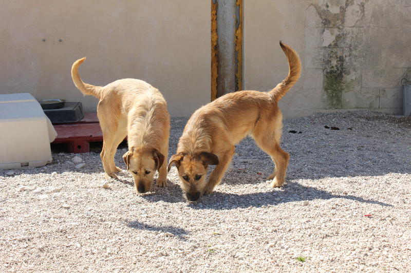 Mittlerweile traut er sich so langsam, mit den vorhandene Hunde der Pflegestelle Kontakt aufzunehmen und beschnuppert zuerst die Hündin und geht danach sofort zum Rüden,