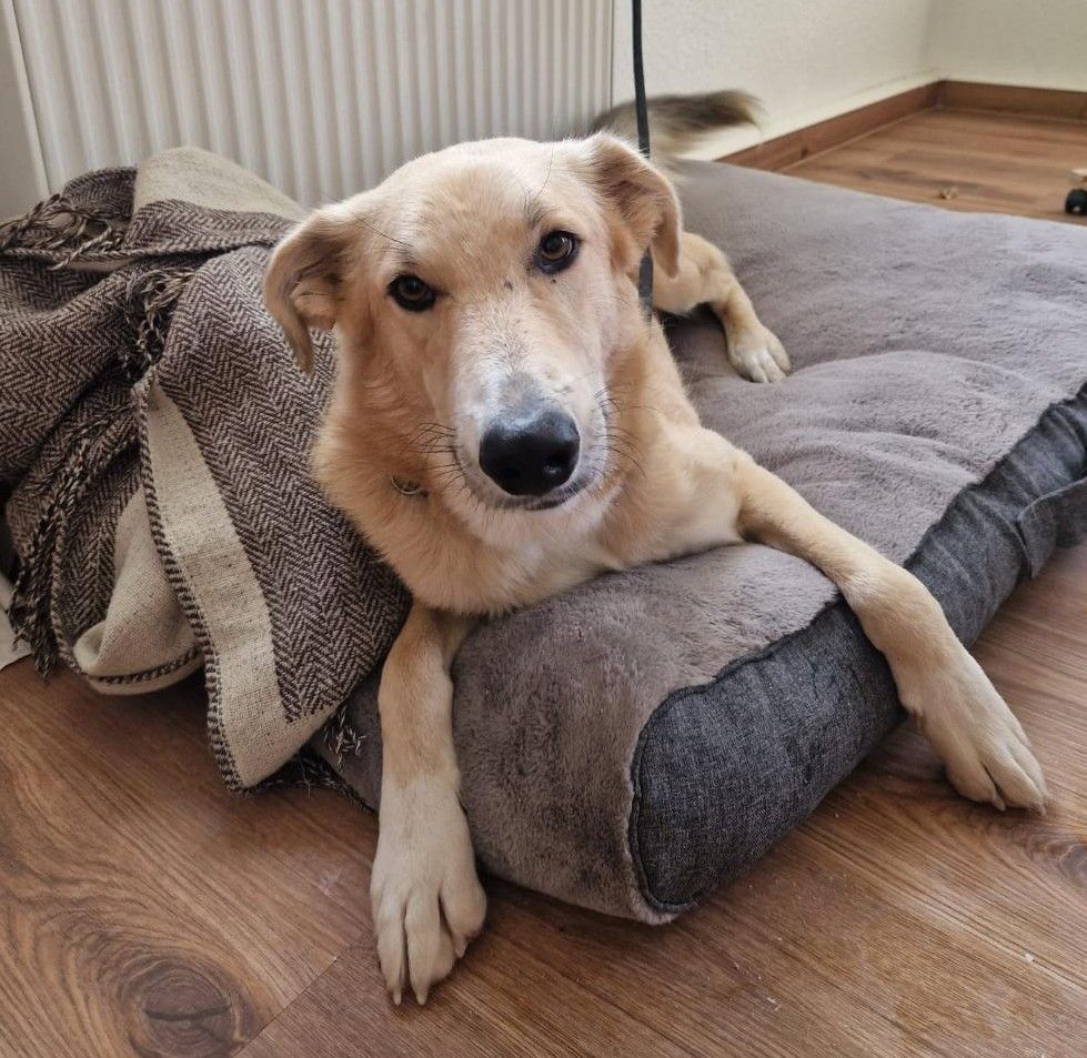 Friedo macht große Fortschritte mit dem Alleinsein - auch wenn es ihn noch beunruhigt und er einen ruhigen Vorlauf braucht. So kann er jetzt 3 Stunden an seinem gewohnten Ort gut für sich bleiben; bei Radiomusik - winselt er zwar noch, aber er beruhigt sich dann wieder. Wie alles andere, lernt er auch hier schnell.In abgegrenzten Bereichen zeigt sich auch, dass er sehr vertrauensvoll in der Nähe seiner Menschen bleibt. Der Rückruf klappt bereits gut, auch wenn andere Hunde dabei sind. Friedo zeigt sich sehr futtermotiviert. Die Tendenz zu jedem Menschen zu laufen, lässt ebenfalls bereits nach. Bei Stadtgeräuschen wird er immer sicherer und auch Autos machen ihm keine Angst mehr.Sozial zeigt er sich ganz wunderbar. Rüden, Hündinnen, selbst aggressives Angehen - Friedo bleibt bei allem sehr ruhig und will spielen.Er wird auch ruhiger und zeigt sich sehr verkuschelt.