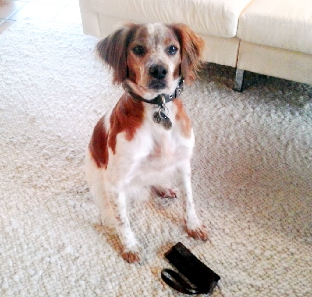 Auch hat er diese Woche gelernt, den Staubsauger nicht mehr 'anzugreifen, sondern er nimmt nun Leckerli während des Saugens und wedelt mit seiner kurzen Rute.